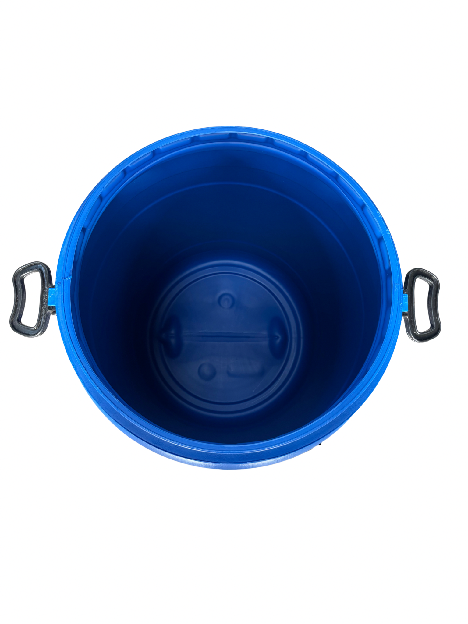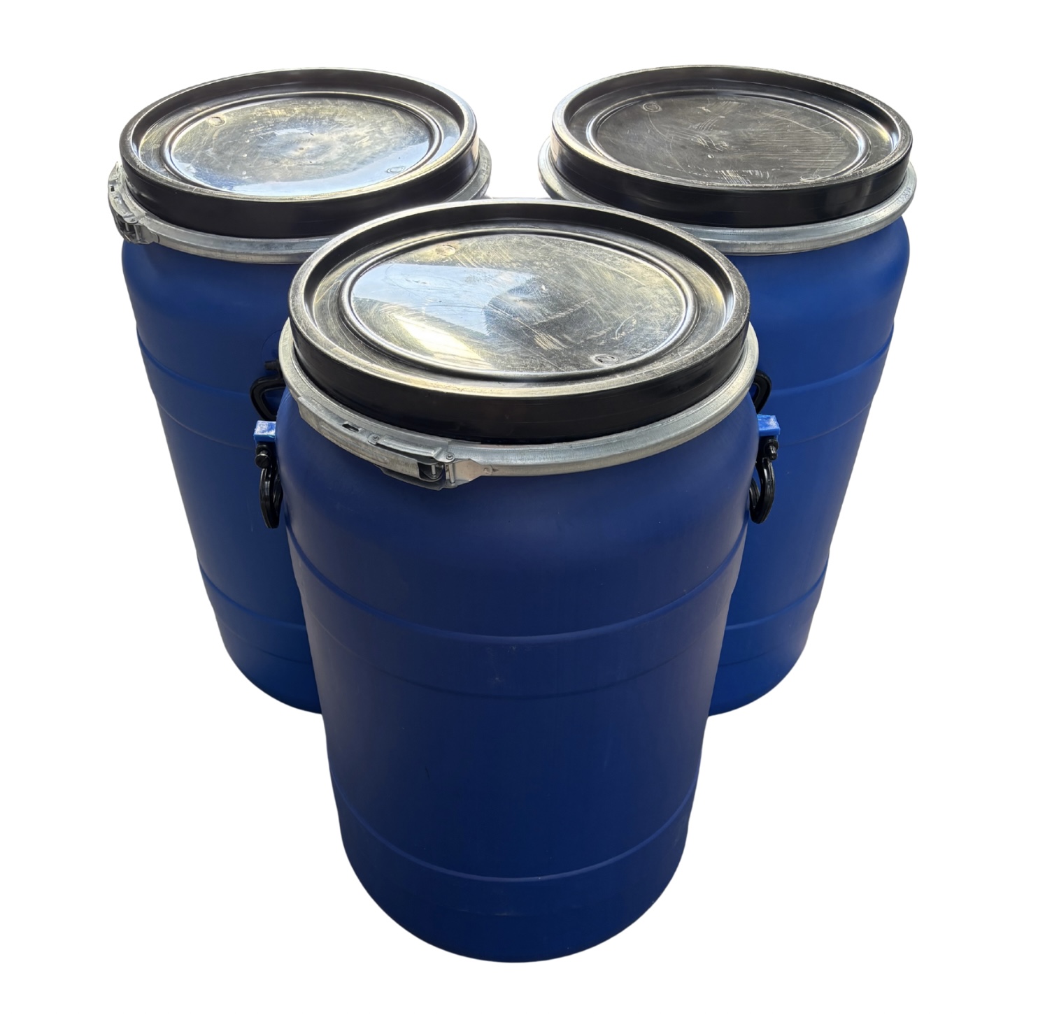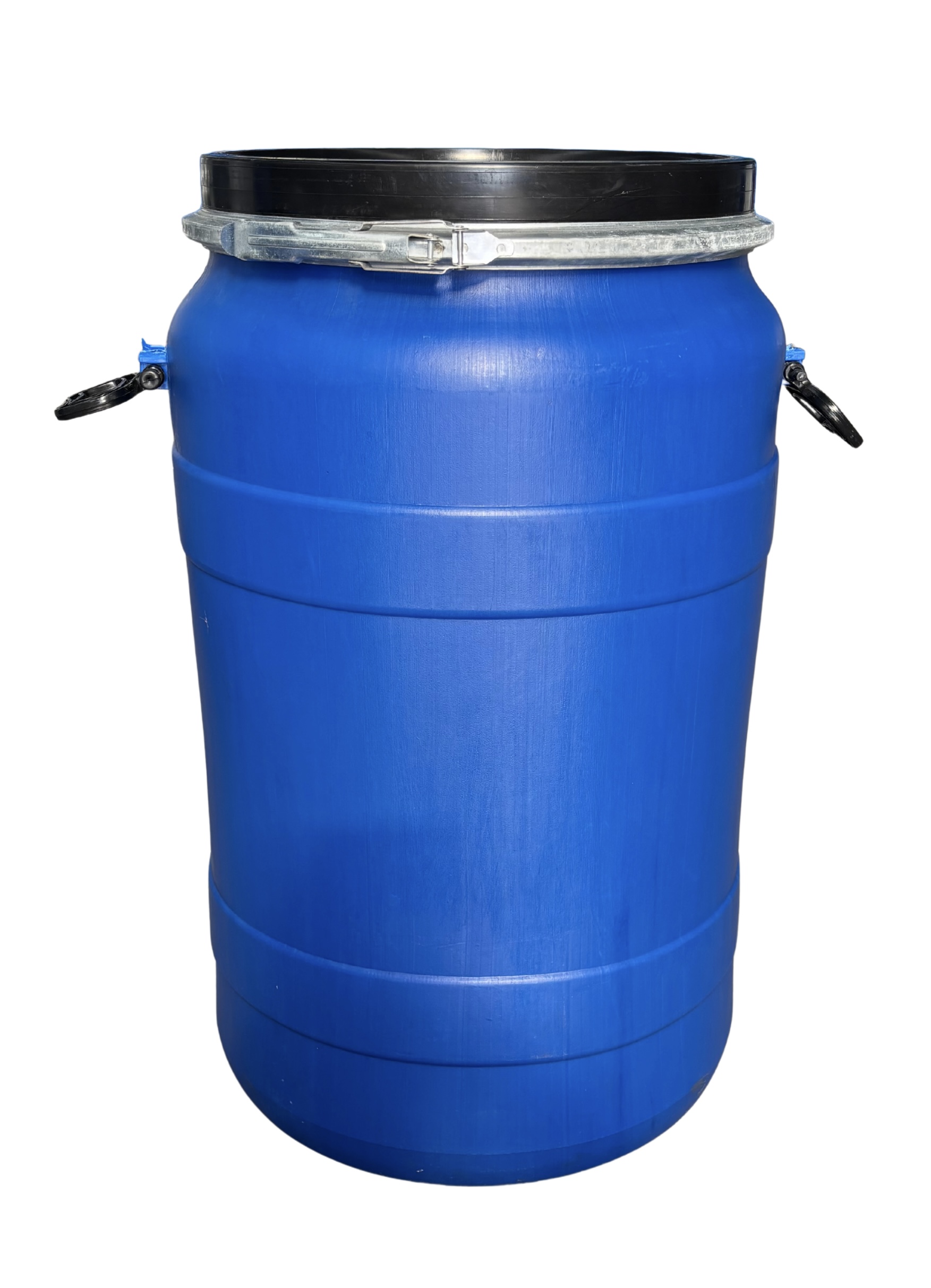 Műanyag levehető tetejű 90-100 literes mosott, kék színű műanyag hordó, egyenes falú (amerikai típus)