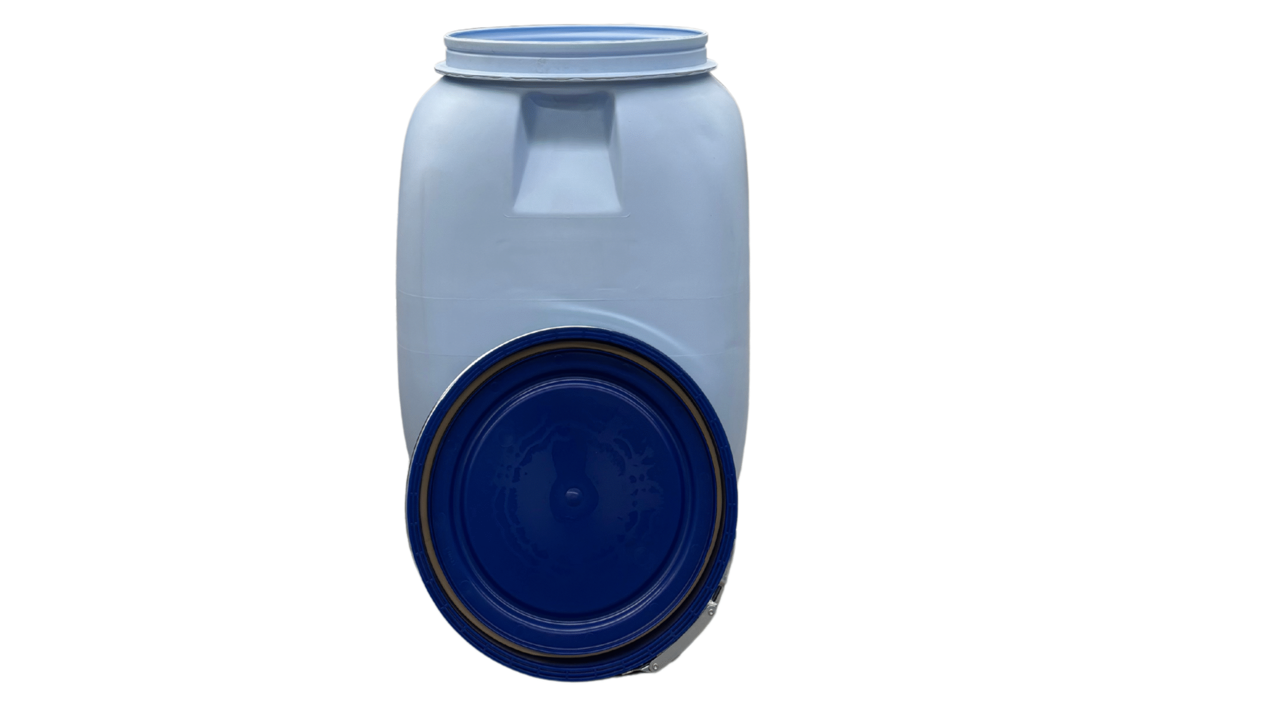 Áru megnevezése: Műanyag levehető tetejű 60 literes mosott, világoskék színű műanyag hordó. UN , / süllyesztett kialakítással a könnyebb emelés miatt /