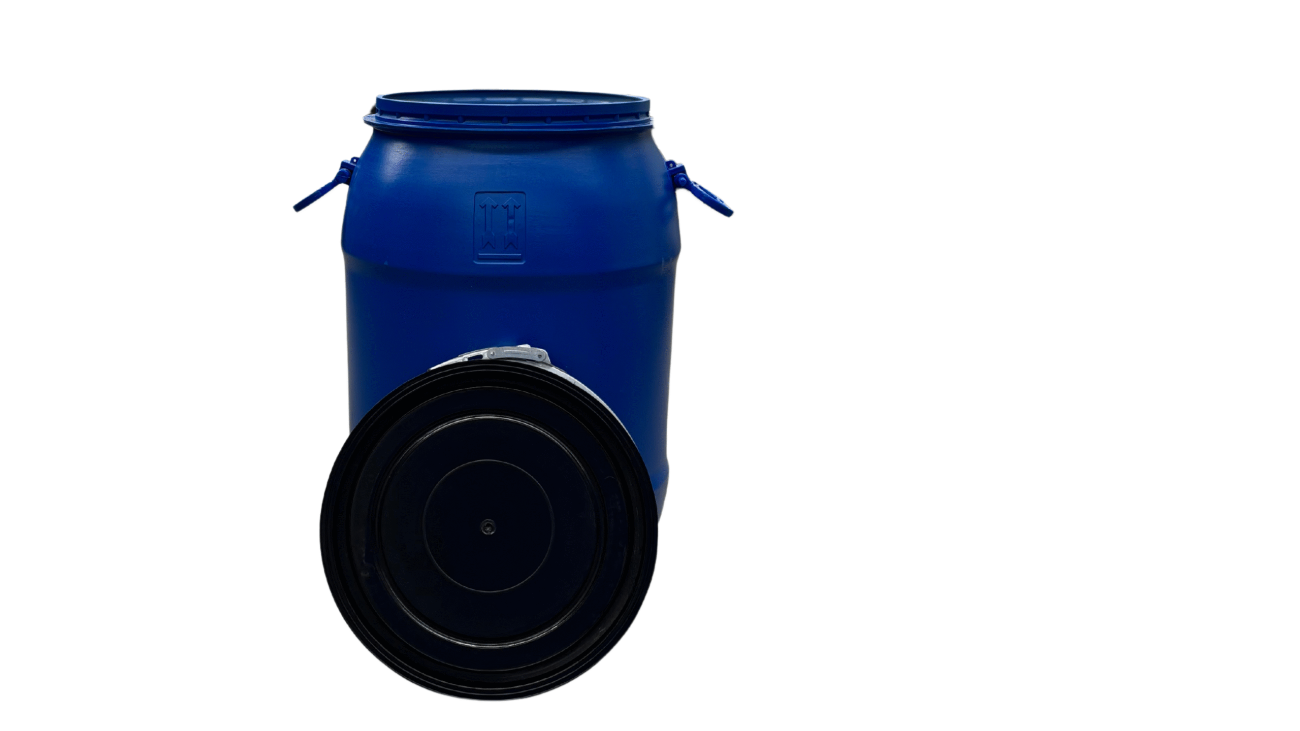 Műanyag levehető tetejű 70 literes, mosott, kék színű műanyag hordó.( két oldalsó füllel)