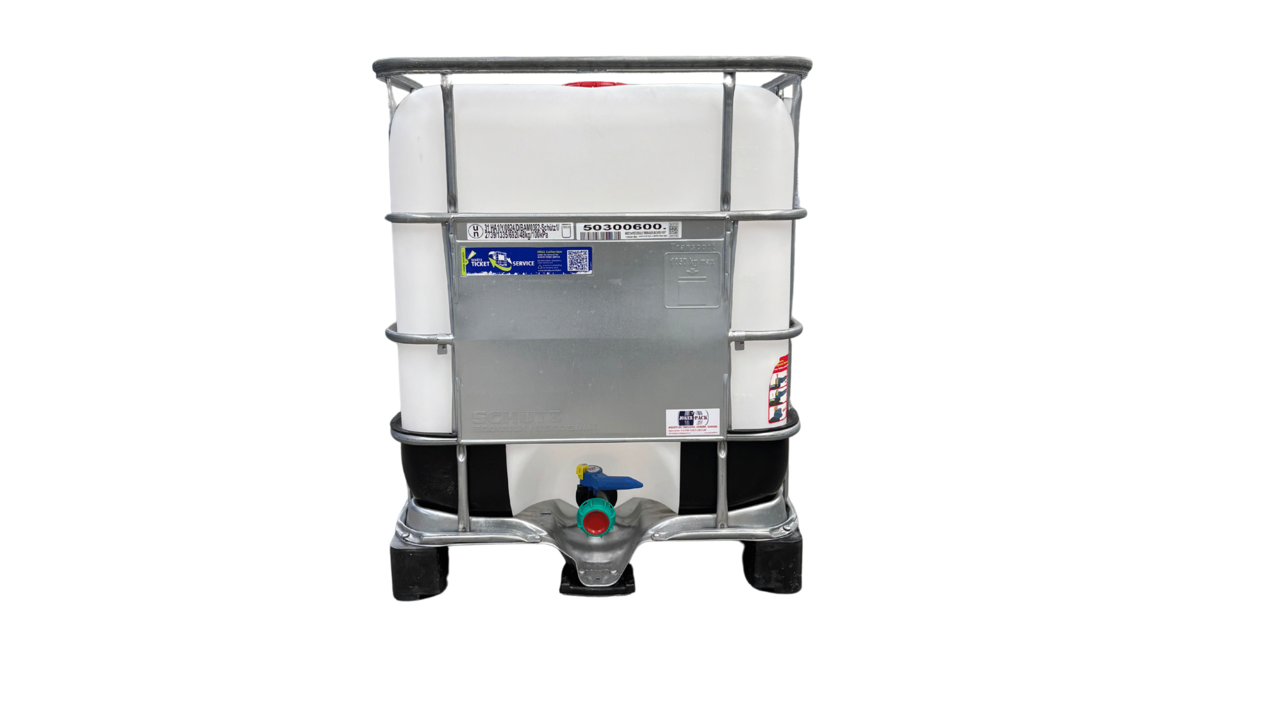 IBC TARTÁLY, SCHÜTZ 640 literes mosott műanyag raklapos IBC tartály ,erősített ,UN minősítéssel 2025-ös évjárat