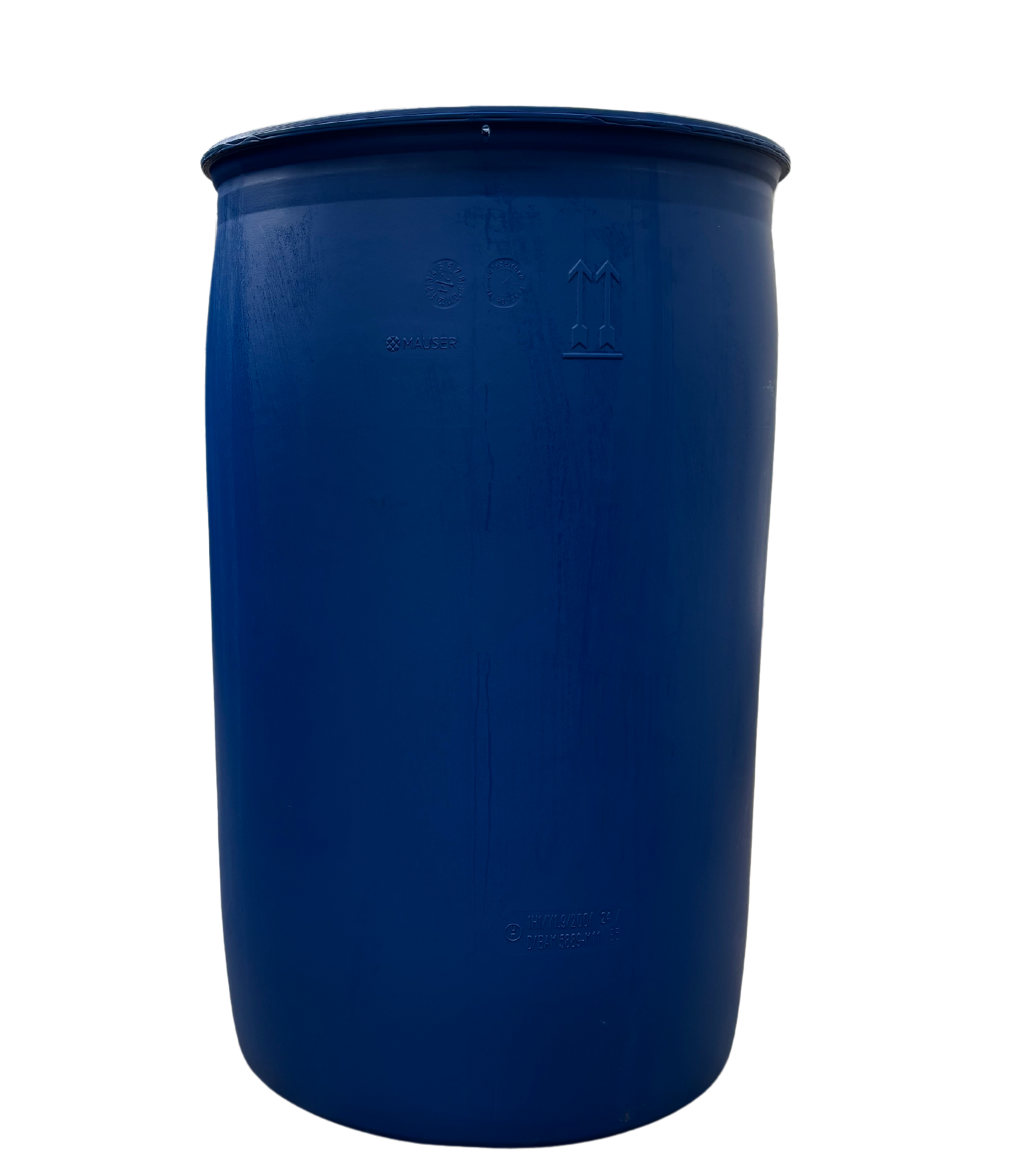 SCHÜTZ vagy MAUSER 220 literes mosott ,kék színű, rögzített tetejű tri-sure záras UN minősített műanyag hordó.